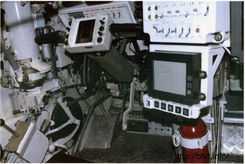 Такое решение можно назвать весьма смелым, особенно для наземной техники, где условия намного более жесткие, чем в авиации. Справа пульт управления АВСКУ-Е (аппаратура внутренней связи, коммутации и управления). Под пультом - оптический датчик системы противопожарного оборудования (ОД1-1С). Установка оптических датчиков и быстродействующих баллонов в боевом отделении обеспечивает обнаружение пожара и выброс огнетушащего состава за время не более 150 мс. Такие датчики установлены по всему периметру капсулы