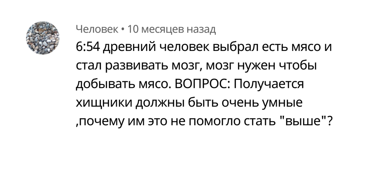 Именно что помогло. Если мы будем сравнивать хищников и нехищников одинакового размера, то хищники всегда-таки умнее. Собачка умнее овцы при прочих равных размерах. Но наши предки были не совсем хищными. Наши предки стали всеядными. И у наших предков, в отличие от хищных, не было специализации, и был долгий-долгий собственный путь.