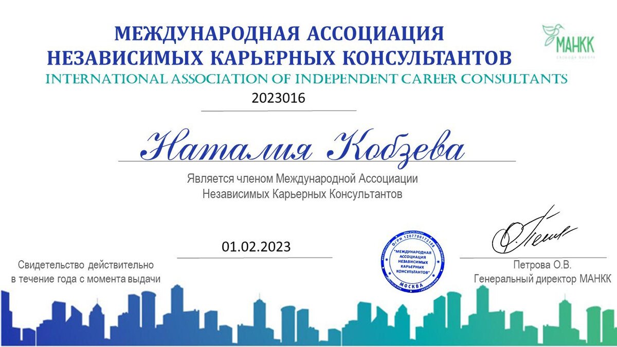 Многие наслышаны о пользе нэтворкинга или социальных связях для профессионального или личного развития. Хочу поделиться своим своим кейсом и результатами участия в одном из профессиональных сообществ для карьерных консультантов. В начале февраля я продлила свое членство в Международной Ассоциации Независимых Карьерных Консультантов (МАНКК) и получила уже второй по счету сертификат. Системное общение с коллегами открывает новые горизонты 2023 года в плане профессионального развития. Для меня наше сообщество является важной и очень результативной возможностью общения с опытными коллегами (они щедро делятся своими знаниями и опытом!), развития экспертизы в сфере карьерного консультирования и просто общения с приятными мне людьми. Какие возможности дает мне МАНКК как карьерному консультанту: