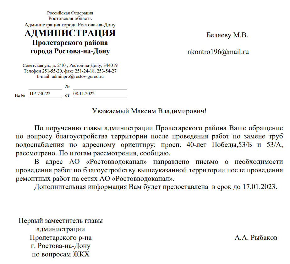 Публикуем ранее поступившие ответы по обращению жителя Ростова-на-Дону по поводу ранее раскопанной и плохо восстановленной дороги (https://nkregion.ru/news/dorogu-perekopali-god-nazad-i-ploho-vosstanovili/). По поручению главы администрации Пролетарского района Ваше обращение по вопросу благоустройства территории после проведения работ по замене труб водоснабжения по адресному ориентиру: просп. 40-лет Победы,53/Б и 53/А, рассмотрено. По итогам рассмотрения, сообщаю. В адрес АО «Ростовводоканал» направлено письмо о необходимости проведения работ по благоустройству вышеуказанной территории после проведения ремонтных работ на сетях АО «Ростовводоканал». Дополнительная информация Вам будет предоставлена в срок до 17.01.2023. В дополнение к ранее данному ответу по вопросу благоустройства территории после проведения работ по замене труб водоснабжения по адресному ориентиру: просп. 40-лет Победы,53/Б и 53/А, сообщаю. Специалистами МКУ «УЖКХ Пролетарского района» совместно с представителями ре