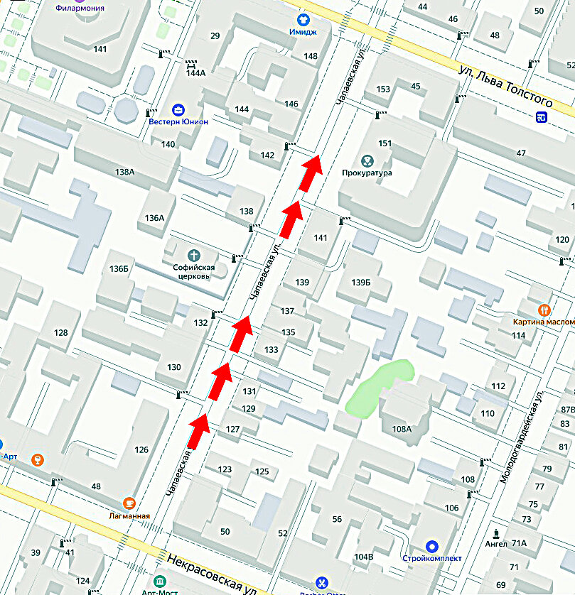 Сейчас мы находимся на участке между Некрасовской и Льва Толстого. Главные здешние достопримечательности мы уже видели, осталось осмотреть полтора десятка старых домов и еще несколько относительно новых, построенных в период с 1980-х по 1990-е годы. Начнем осмотр с остатков усадьбы князя Оболенского (ул. Чапаевская, 123).