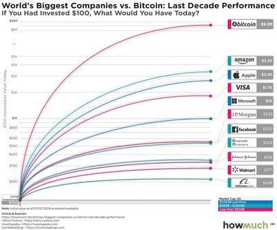 На сегодняшний день биткоин является одним из самых прибыльных активов в истории. С точки зрения рентабельности, он оставил далеко позади такие громкие имена, как Amazon, VISA, Microsoft и JP Morgan.