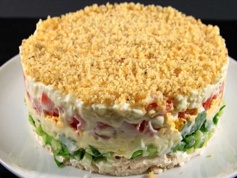 Выкладываем слой огурцов, слой зелени. Затем слой тертого сыра. Солим, перчим. Смазываем майонезом.