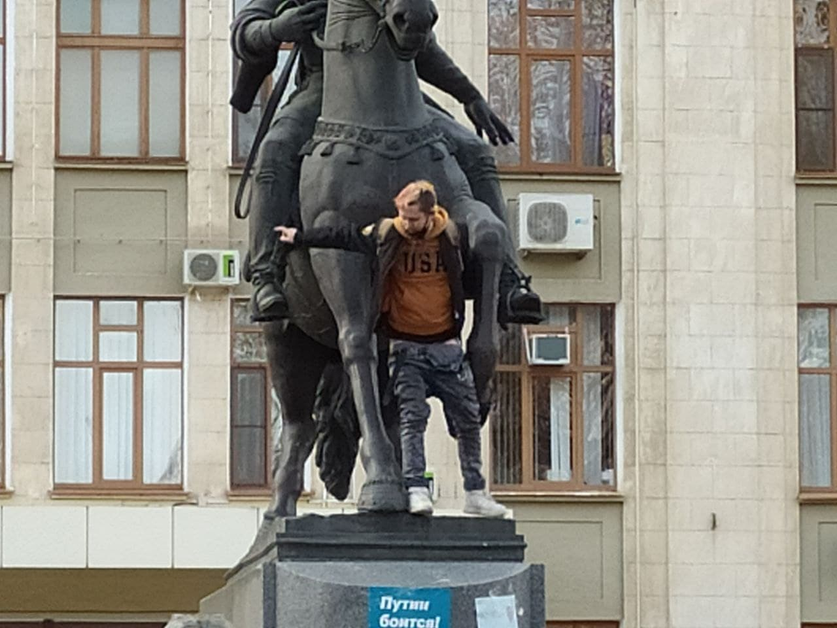 Это не было бедой, если бы еще через пару часов автор стрима не показал себя во всей красе. Именно он позже выполз на памятник казаку напротив здания администрации края и оголил свои филейные части.