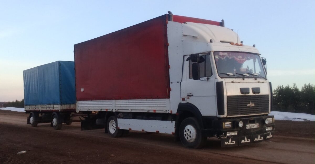 Следующий автопоезд выделяется общей стилистикой тягача и прицепа. Трёхосный бортовой грузовик МАЗ-6303 был выпущен в 1996 году, но не был таким красивым, когда покидал ворота завода.
