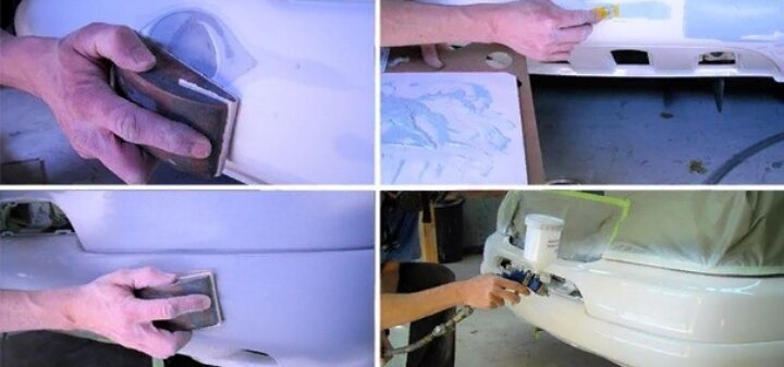 Немножко отличается от первого случая, так как кроме того сто нужно будет отдельные места обрабатывать шпаклевкой для пластика, дополнительным этапом будет устранение дефектов, возможно паяние пластика.