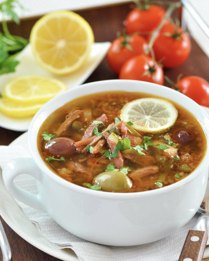 Разольем солянку по тарелкам. Украсим ломтиками лимона и оливками. Отдельно подадим сметану.