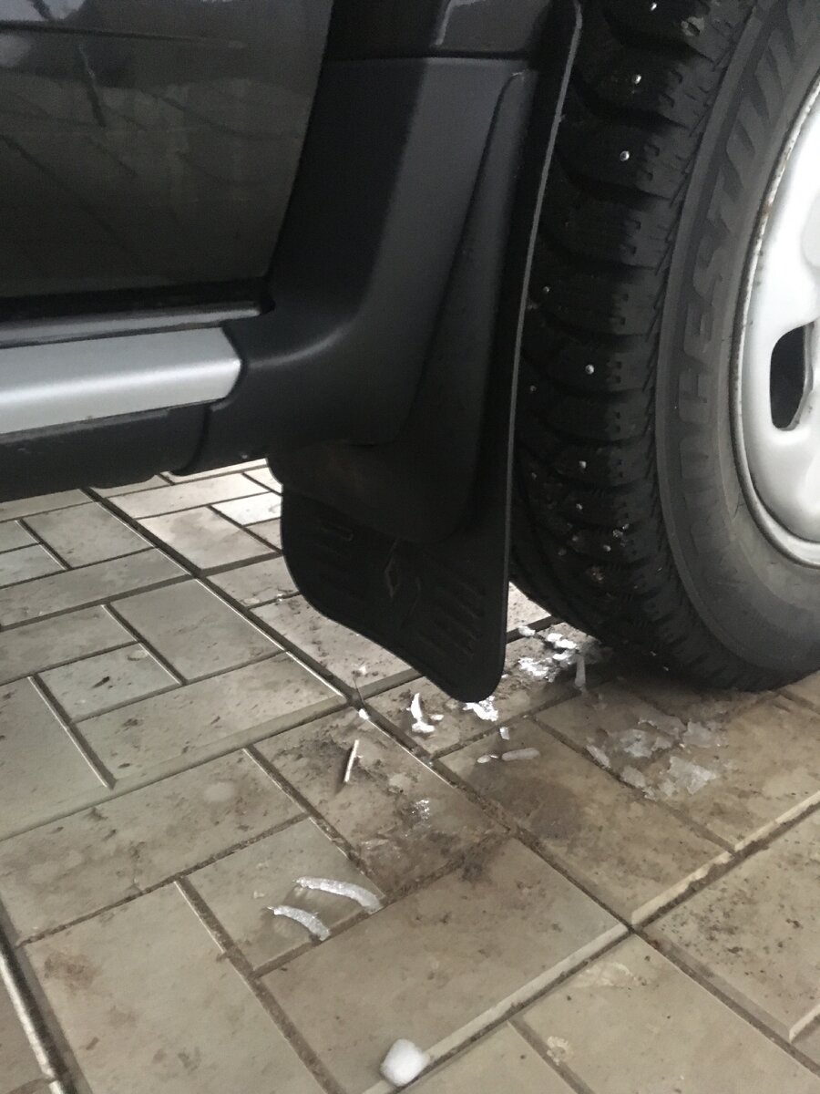 - Первое на что я обратил при выборе подержанного Дастера, это то что задние крылья у них покрыты сколами, или уже перекрашены. На автомобиле который купил я задние крылья быль покрыты мелкими сколами. Когда же я первый раз проехал по грязи, выйдя из машины я увидел что задние крылья были увешаны кусками грязи с мелкими камнями вперемешку. Я понял что Дастеру нужны брызговики побольше. На просторах интернета я нашел много способов: кто то покупал увеличенный за полторы тысячи, кто то ставил лопухи sparco. Но я пошел другим путем купил реношные брызговики за 400 рублей (от какой модели не помню):