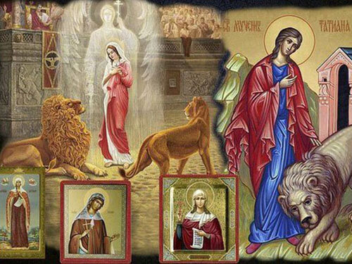 Святую Татиану бросили на арену цирка и выпустили туда же дикого льва, но зверь стал ластиться к ней и лизать ей ноги и, в конце концов, бросился на одного из мучителей и разодрал его в клочья.