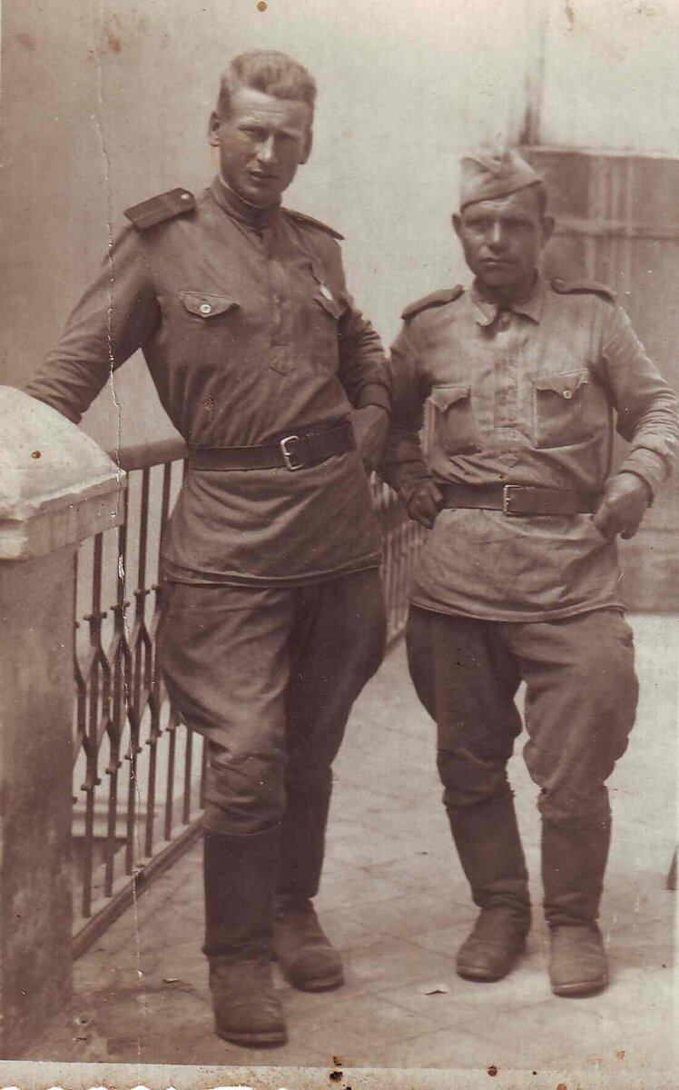 Перемышль. Кладно. Прага. Надписи на обороте фронтовых снимков моего деда Ивана — завершение его военной эпопеи, последние деньки войны, или первые дни после Победы. 10 фотокарточек, одну можно разрезать по вертикальной белой линии на две и получится 2: на ней два разных кадра. На одной солдат Ткачев стоит один, облокотившись на тумбу с резной кованой решеткой, на другой- с товарищем, на этом же фоне. Она подписана химическим карандашом:«На память маме и сестре от брата и сына в Отечественной войне за Родину. Я еду к вам в гости. Привет из Польши. Перемышль. Ваш сын и брат Иван Васильевич Ткачев.» Еще один снимок с белым трофейным конем: «Привет из Праги.Столицы ЧехоСловакии». И третий снимок, на котором двое его сослуживцев сидят на стульчиках, а он между ними стоит, тоже из Чехословакии, их города Кладно- жене, подписан: «На долгую память о Великой Отечественной войне, я со своими боевыми друзьями, с которыми все время вместе...»