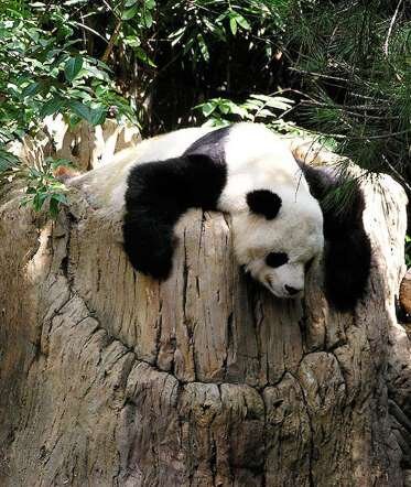 Панды делят свой день на две части: первая – сон, вторая – корм. После долгого поедания бамбука, гигантская панда любит забраться повыше и хорошенько поспать.