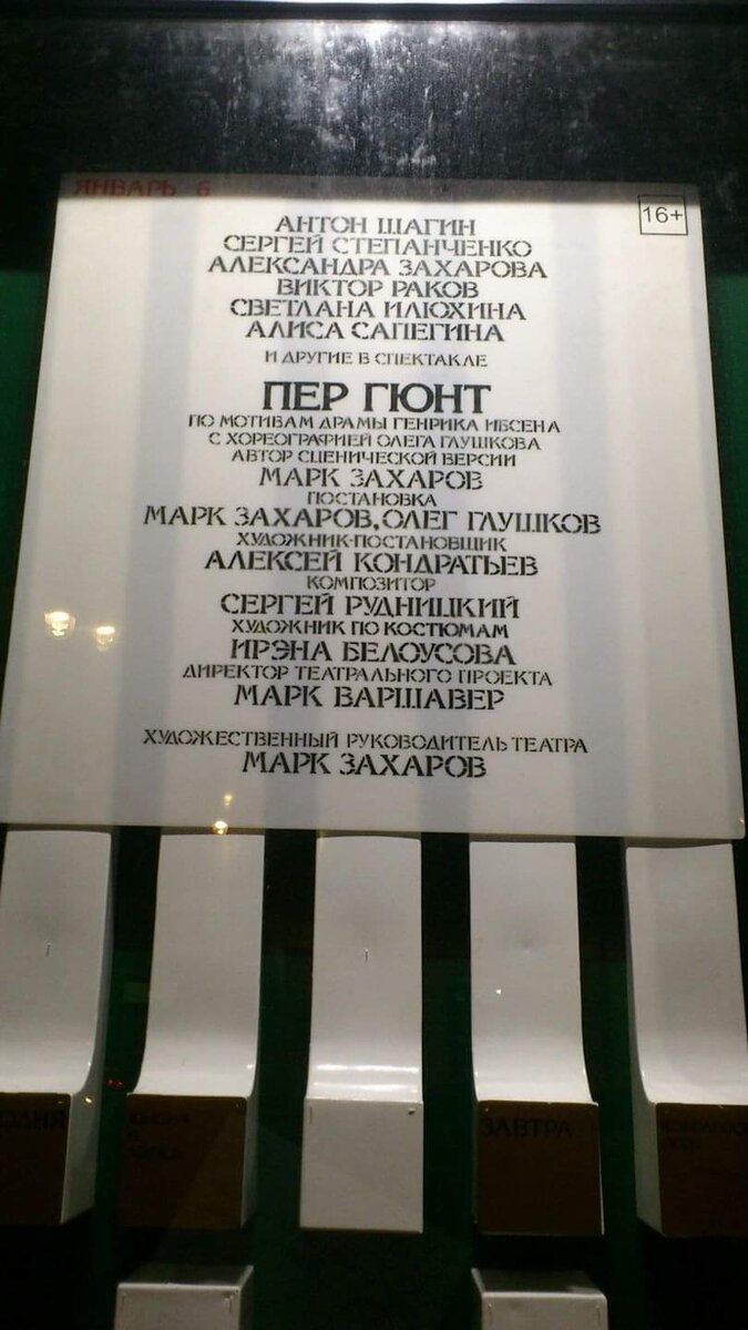 Несмотря на рождественский мороз, в Ленкоме было многолюдно. Там сегодня давали Пер Гюнта. Обстановка монолитного театра напомнила театральную столицу начала 20 века-шубы, пальто, дамы в вечерних платьях, звенящие украшениями, кавалеры-ухаживающие за дамами и подносящие шампанское в буфете...