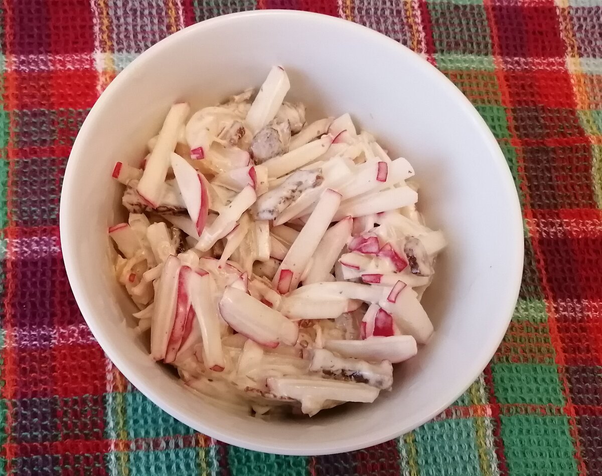 Этот салат из моей авторской кухни. И я очень горжусь, что в своё время изобрела его. Его я называю салат "Мясной".
