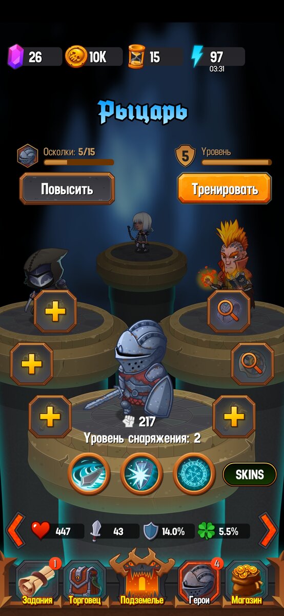 Снаряжение используется для прокачки персонажей. Собрав полный комплек, нам нужно будет потратить золото и перейти на более высокий тир снаряжения и Так покругу. Так же у наших героев есть прокачка уровней. Тут стандартно - убиваем мобов, получаем опыт, получаем уровень, в итоге становимся чуток сильнее. Помимо всего этого, героям можно повышать качество (звёзды). Тут мы собираем элементы героев из сундуков, набрав нужное количество, тратим н-ое колличество золото и добавляем звезду.