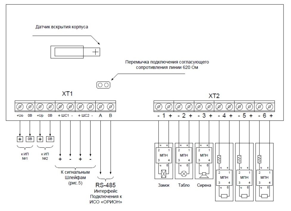 Мы видим на схеме подключения, в правом нижнем углу, колодку «ХТ2», на которую как раз и подключаются цепи управления СОУЭ («2» и «3») и прочие пусковые цепи, что не суть важно. Во всех случаях, все эти цепи необходимо контролировать на целостность, в соответствии с требованиями нормативных документов. Цепи запуска пожаротушения (АУП) – это контакты «4», «5», «6», мы сегодня не обсуждаем, так как не по теме, обращаем внимание на контакты «2» и «3». Как мы видим, действительно, оконечного резистора в цепи нет, но зато присутствует модуль «МПН» (модуль подключения нагрузки). Схема принципиальная этого модуля приведена ниже: