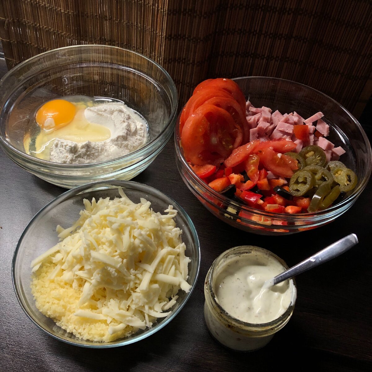 1) Помидоры, маслины, перец, ветчину - нарезаем, сыр натираем, сметану,майонез, хмели-сунели, сушенный чеснок и прованские травы смешиваем