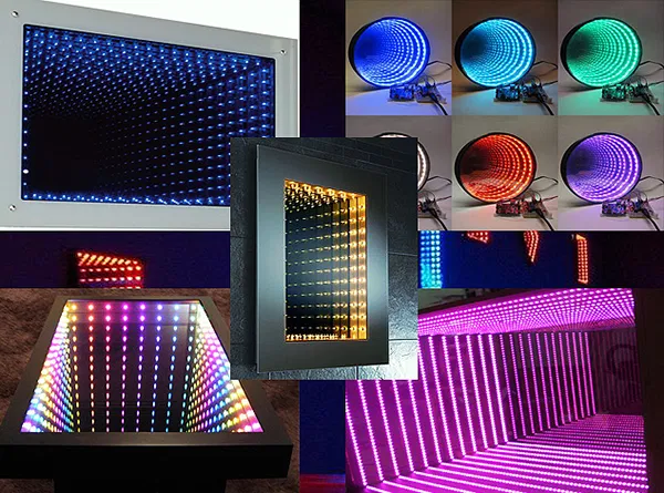Разная форма и глубина рамок позволяют создать частичный или полный эффект бесконечного тоннеля. Если на внутреннем (заднем) зеркале закреплены дополнительные рамки, также с укрепленными на них диодными лентами, можно получить и более интересный рисунок.