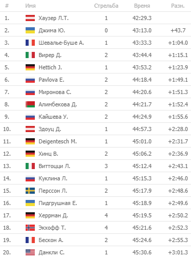 Женский масс-старт прошел с переменным успехом. Стоит отметить, что сразу 4 биатлонистки участвовали в гонке. Попасть на пьедестал не удалось, но наши спортсменки не финишировали в третьем десятке.