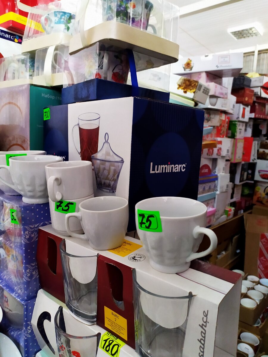 При входе, сразу бросается в глаза полка с разным разнобоем и для особо не привередливых есть чашки по отдельности, где цены начинаются от 75 рублей. Допустим на работу такую можно купить и не жалко если, что-то случится.