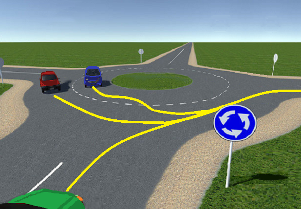 И это означает, что водитель зеленого автомобиля должен уступить дорогу уже находящимся на кольце водителям красного и синего автомобилей. В данной ситуации водитель зеленого автомобиля проедет крайним.