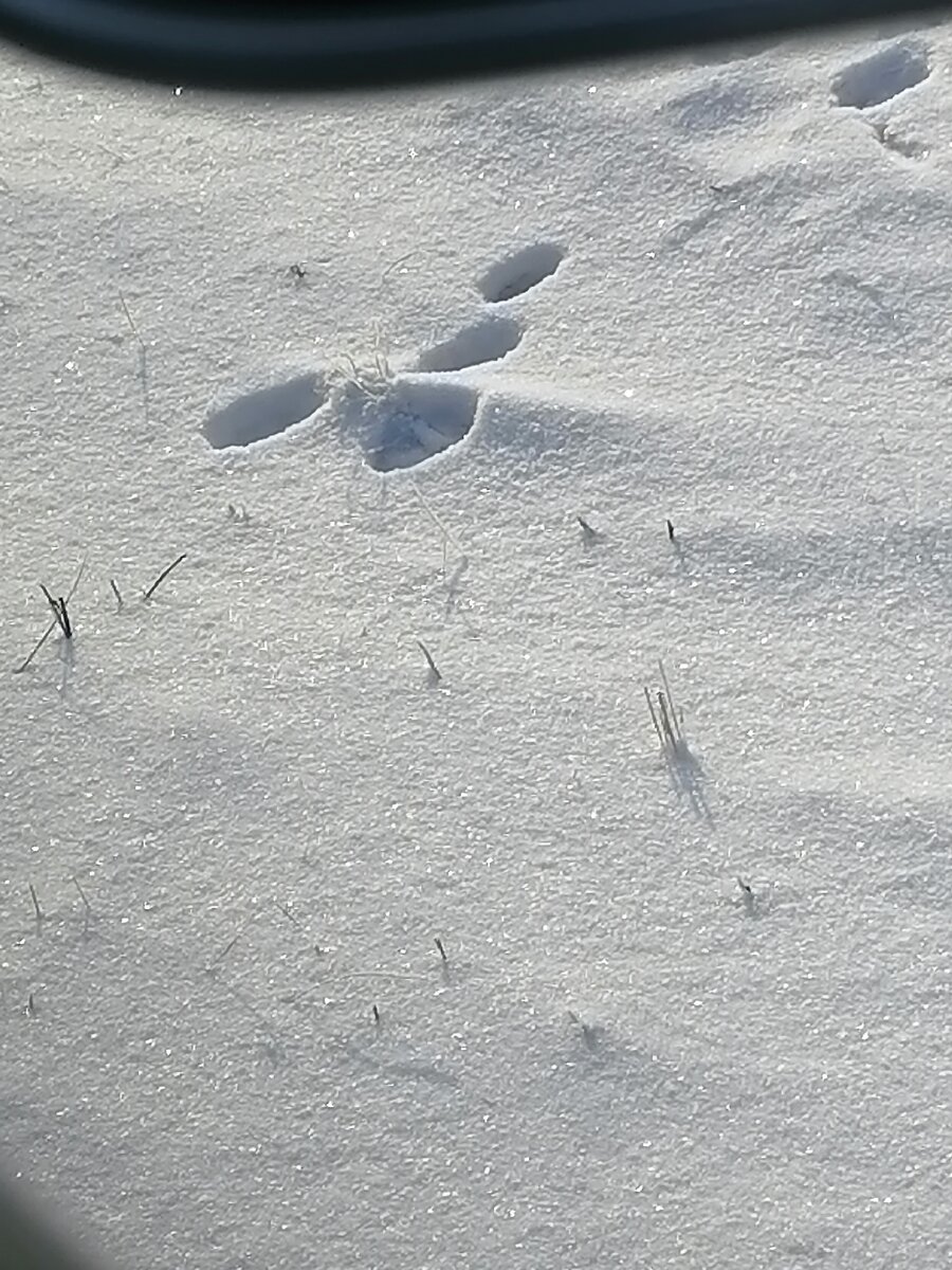 Вчера ездила посмотреть и больше узнать про возрастную лайку, которую ее хозяин внезапно решил продать. По дороге видела много различных следов на снегу. Там и косули пробегали(охотники почему-то называют их козлами), и лисы, и енотовидные собаки, и зайцы. Сфотографировала след зайца. Можно сказать, зайчонка, потому что следышки совсем маленькие. Зайчишка скакал вдоль дороги. Местами натоптаны тропы.