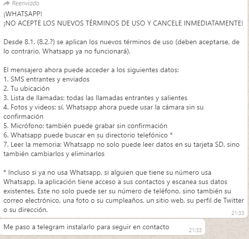 Похоже, что больше всего беспокоит новая политика Whatsapp-это обработка данных, поскольку помимо обмена ими или, скорее, продажи третьим лицам, Facebook теперь будет иметь доступ к хранению и управлению чатами и информацией, сохраненной на смартфоне (как если бы это было раньше). Кроме того, они боятся, потому что, даже если приложение не установлено, но какой-то другой контакт в телефонной книге имеет его, вы можете получить доступ к нашему устройству и сканировать существующие данные. И это что-то новое? Они боятся, потому что это уже небезопасно.… она никогда не была на 100% безопасной! Как бы они ни хвастались своим сквозным шифрованием E2EE, так как есть много способов получить доступ к приложению, и уже много случаев о взломах этого приложения, как это было в случае Джеффа Безоса, основателя и генерального директора Amazon, который с помощью простого сообщения получил доступ ко всей информации о своем устройстве.