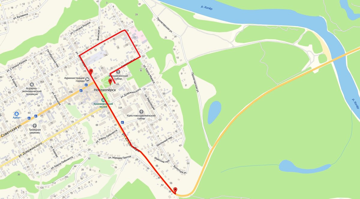 Дорога, по которой мы спускаемся вниз к Хопру, имеет сразу два разных названия – улица 25 Октября и улица Мамаев Проток. Это происходит потому, что здесь кривая извилистая улица Мамаев Проток примерно на двести метров сливается с прямо идущей улицей 25 Октября, из-за чего жилые дома справа от дороги относятся к одной из них (ул.Мамаев Проток), а слева – уже к другой (ул.25 Октября). Различные карты на этом двухсотметровом участке дороги путаются в данных, и указывают кто какое название улицы, а правильнее, получается, было бы отмечать сразу обе из них. На спуске прямо перед нами открывается красивый панорамный вид обширного лесного массива в пойме реки Хопёр, через небольшую часть которого и будет проходить наша автодорога сразу после выезда из города.