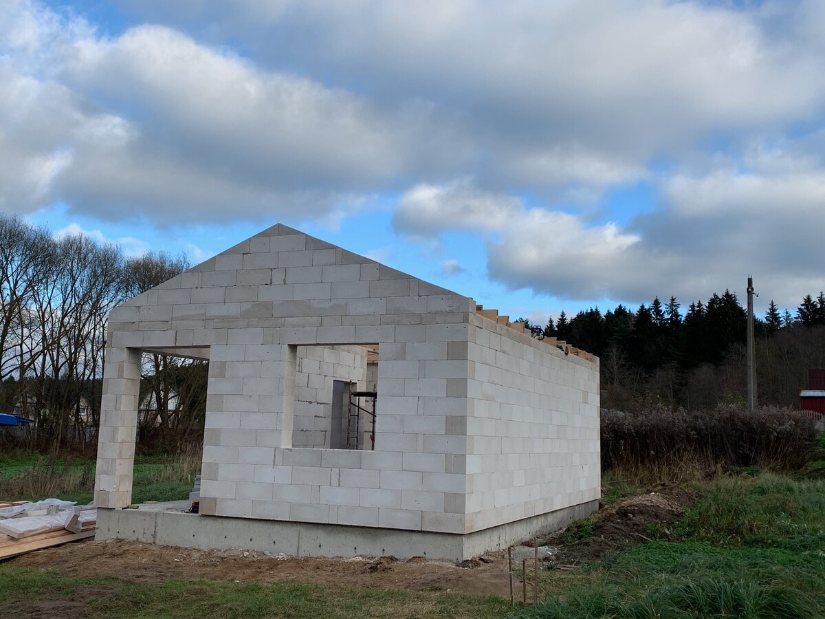 В данном случае фронтоны сделаны из газосиликатных блоков, поэтому коньковый прогон будем опирать непосредственно на стену.