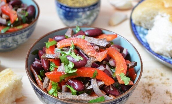Салат "Тбилиси" - яркий, вкусный и сытный представитель грузинской кухни, в состав которого входят овощи, фасоль, говядина и большое количество зелени и специй. Предлагаю немного поэкспериментировать, заменив говядину на говяжье сердце, и приготовить не менее вкусный салат, чем в оригинальном рецепте.