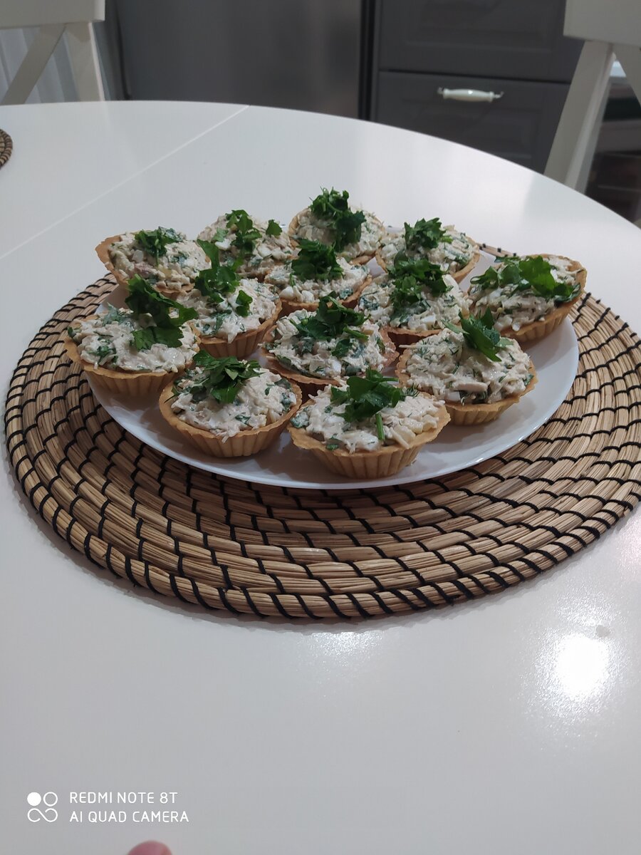 Выкладываем готовый салат в тарталетки украшаем зеленью ( петрушкой) можно сверху присыпать грецкими орехами.