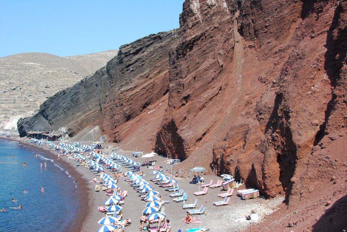 Красный пляж, пожалуй, самый известный и привлекательный на Санторини. Он также считается одним из самых красивых пляжей всей Греции. Небольшой размер пляжа создает очень приятную, тусовочную атмосферу. Часть туристов добираются до пляжа на машинах и автобусе, другие приплывают на лодках по морю. А некоторые просто забираются высоко на гору и наслаждаются открывающимися видами красных и черных вулканических скал.