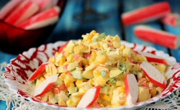 - Салат из крабовых палочек и кукурузы готов. Переложите его горкой в салатник для подачи, по кругу украсьте тонкими кружочками крабовых палочек. Всё - салат можно подавать!