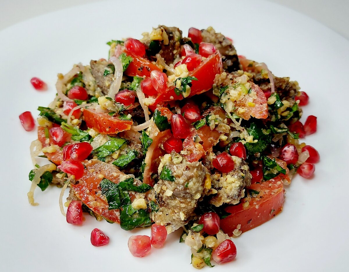 10. При подаче посыпать зёрнами граната. По желанию можно добавить нарубленный свежий перец чили.