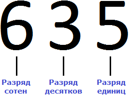 Если говорить простым языком, то разряд это позиция цифры в числе или место, где располагается цифра. Возьмём для примера число 635. Это число состоит из трёх цифр: 6, 3 и 5.