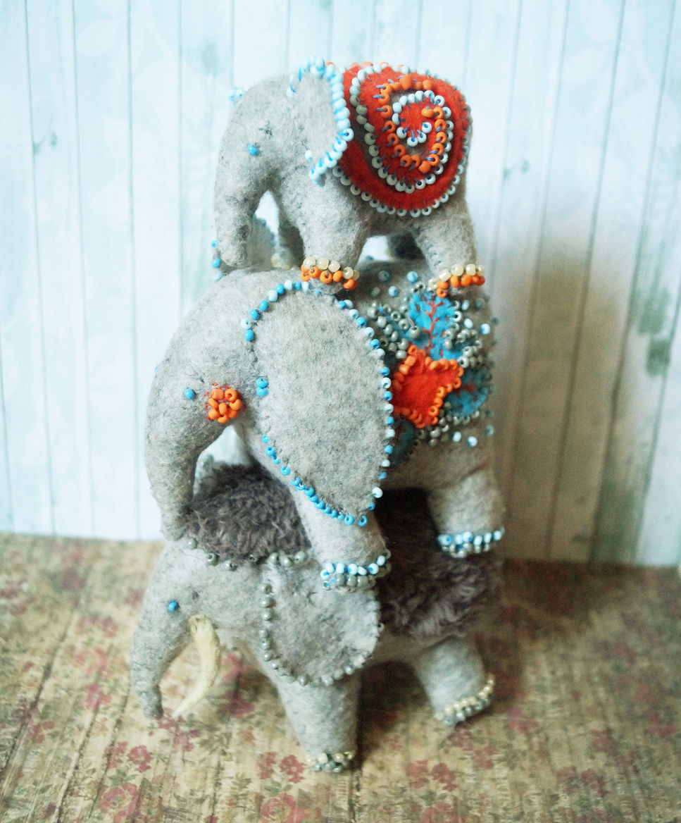 Теперь займемся самым увлекательным — украшением наших слоников. Тут фантазии нет предела: можно сделать вышивку, апликацию из фетра или вышить бисером. Я решила использовать все три варианта.