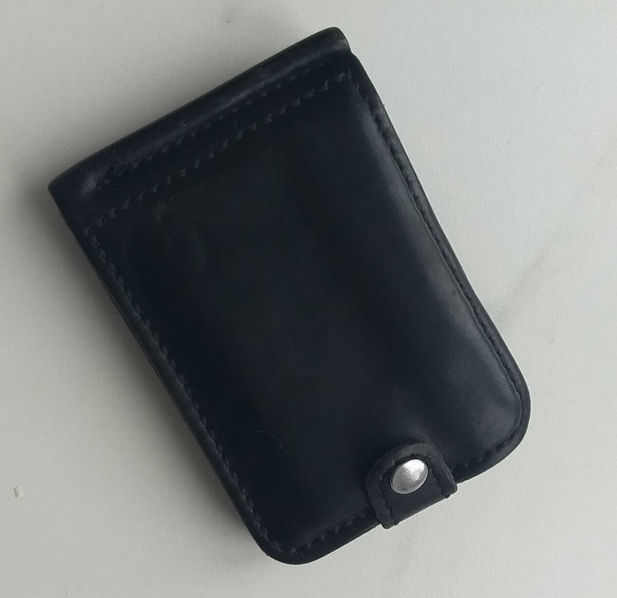 Муж сшил его для себя. Небольшой кошелёк из натуральной кожи, чтобы в карман помещался, без отделения под мелочь, так как на работе каждый день проходит через металлоискатель и звинеть каждый раз он не хотел.