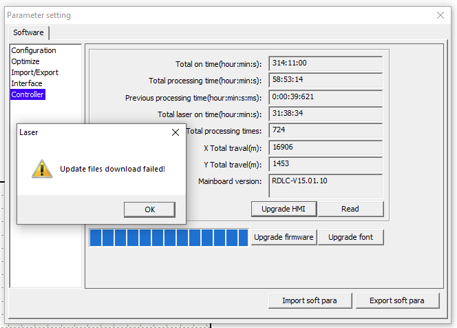 Для решения проблем в контроллера лазерного станка приходиться обновить прошивку контроллера. Обычно это помогает решить проблему.