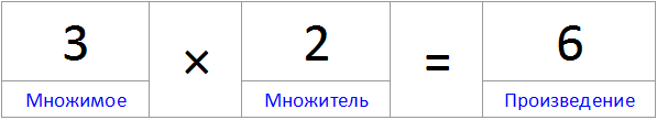 Для начала вспомним из чего состоит умножение. Умножение состоит из трёх параметров: множимого, множителя и произведения. Например, в выражении 3 × 2 = 6, число 3 — это множимое, число 2 — множитель, число 6 — произведение.