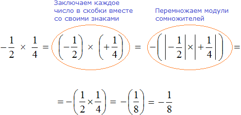 Это умножение рациональных чисел с разными знаками. Чтобы перемножить рациональные числа с разными знаками, нужно перемножить их модули и перед полученным ответом поставить минус.
