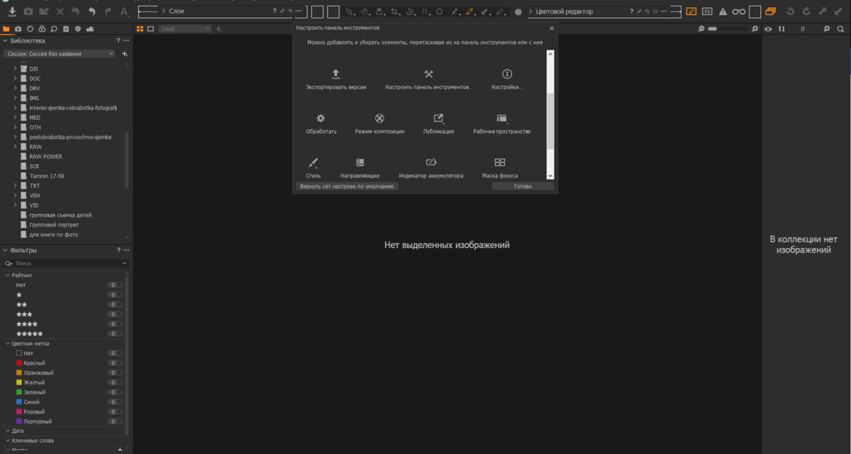 Самое главное, что мы теперь примерно понимаем, что и где. Конечно, интерфейс дикий после Lightroom, но мы вместе с Вами разберемся, как это все настроить под себя. В правой панели содержится шесть вкладок, на каждой из которых расположены инструменты. В обычном состоянии эти инструменты не закреплены и их можно менять местами, а также добавлять на другие вкладки.