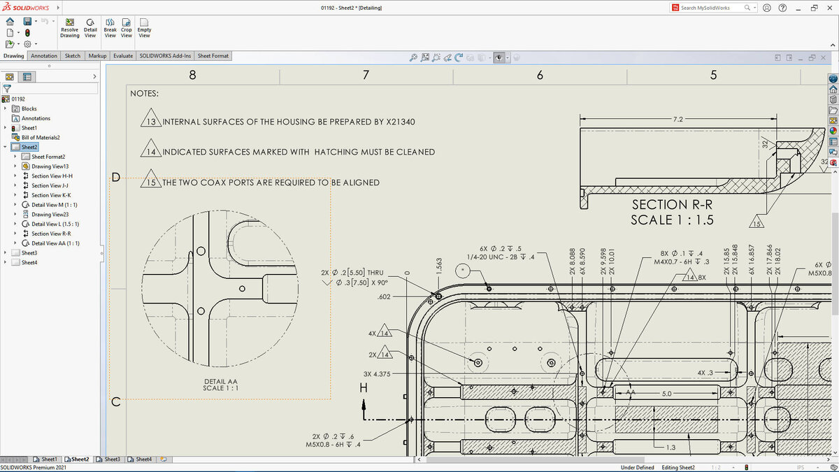 В режиме оформления, который впервые появился в SOLIDWORKS 2020, насыщенные графикой чертежи открываются за считанные секунды, но пользователи при этом не ограничены только средствами просмотра. Можно, например, выполнять такие стандартные задачи, как добавление и редактирование размеров и примечаний. Модель при этом полностью не загружается; тем не менее, в ней сохраняется информация, добавленная на видах чертежа. Стало удобнее наносить условные обозначения отверстий, а также добавлять выносные элементы, виды с разрывами и обрезанные виды. Благодаря ускорению операций с файлами, переключению конфигураций и автоматической установке сокращенного режима, работа даже с самыми сложными сборками не вызывает затруднений.