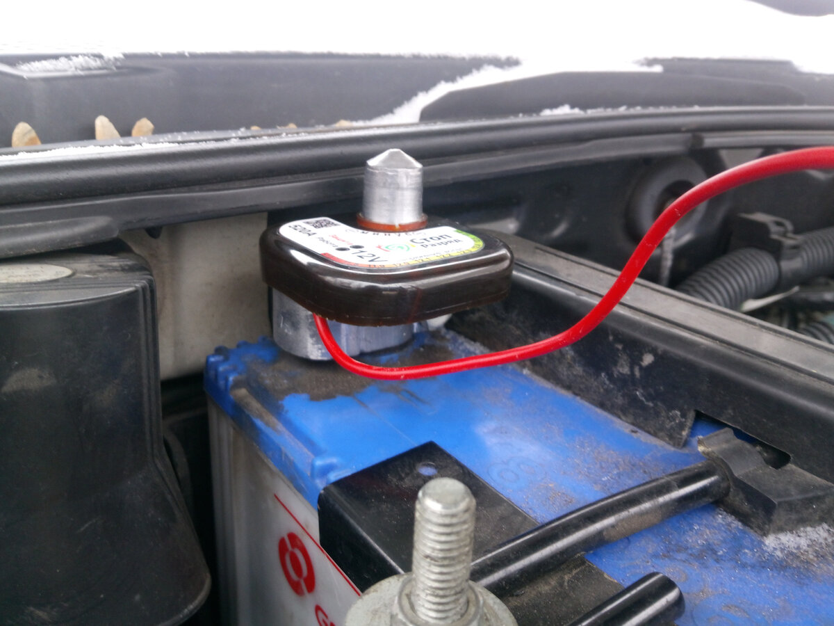 Установка прибора не вызывает особых проблем. Фактически он становится промежуточным звеном между двумя выводами для клемм. Снизу устройство надевается на АКБ, а сверху имеет вывод для подключения минусового провода. Короткий красный провод нужно расположить на плюсовой клемме. Подобное решение подходит для суровых зимних условий и позволяет защититься от непреднамеренного расхода заряда аккумулятора, например, когда водитель забыл выключить фары. Само устройство имеет невысокое потребление - порядка 4-5 мАмпер-час.