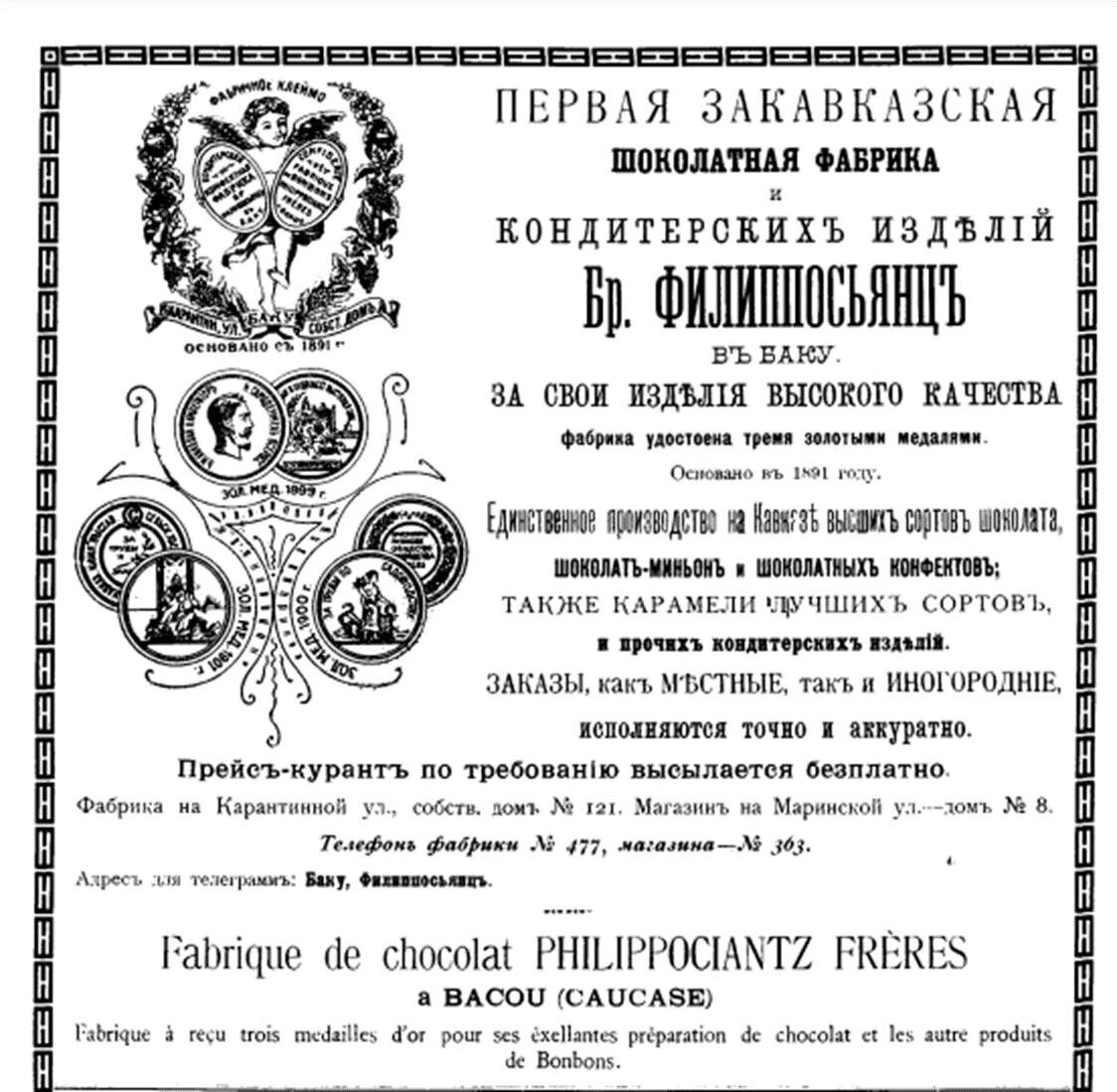 Первая закавказская шоколадная фабрика была основана в Баку братьями Филипосянц. Фабрика завоевала три золотые медали на различных международных выставках.