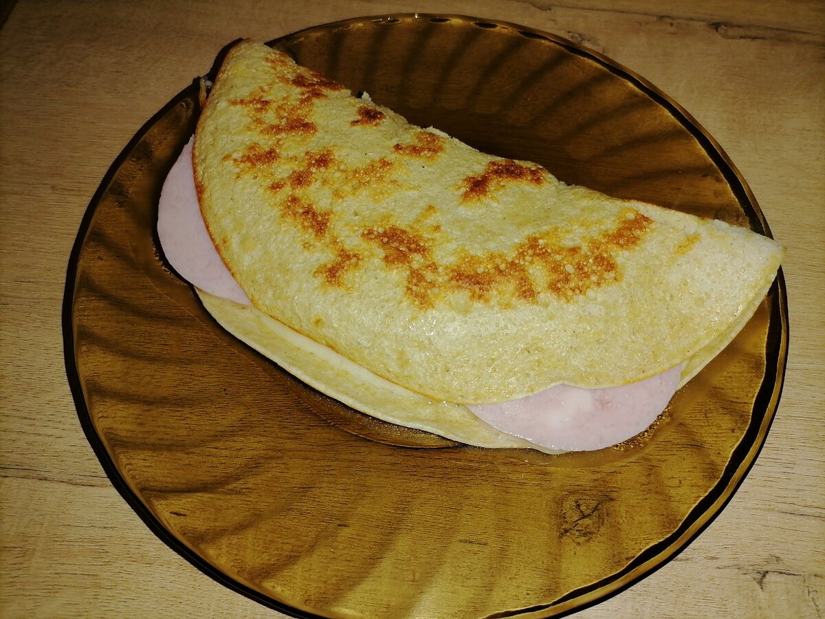 У меня ветчина и сыр. Второй половиной блина накрываем начинку и оставляем под крышкой еще пару минут, что бы сыр расплавился. Блин готов.