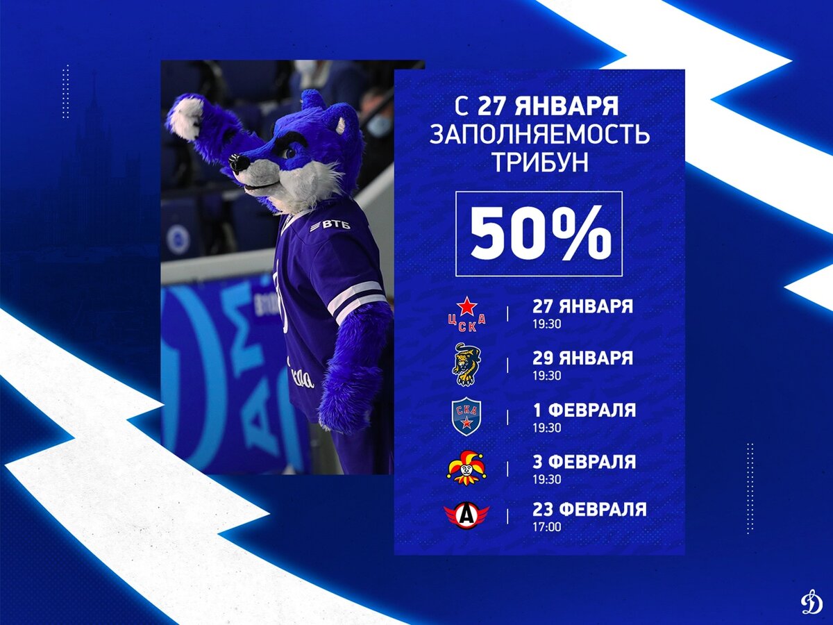 Начиная с матча регулярного чемпионата КХЛ между «Динамо» и ЦСКА допустимая вместимость стадиона составит 50%. Данное решение согласовано Мэрией Москвы, а также Роспотребнадзором. Ждем вас на хоккее! Впереди — решающие матчи регулярного чемпионата и битва за Кубок Гагарина!