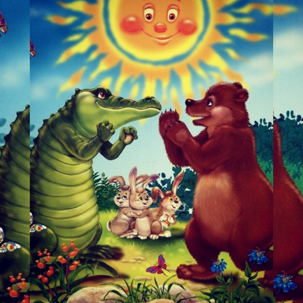 Не смотря на некоторую жестокость в сказке: «разорви его на части, вырви солнышко из пасти», «Уж он мял его и ломал его», произведение является яркой иллюстрацией войны за мир. Автор показывает ребенку, что как бы не был страшен враг, с ним обязательно нужно бороться, особенно если от этого зависит жизнь родных и близких. Поиски медвежат, не увенчавшиеся успехом, означают главенство первопричины над ее последствиями. Ребенок вместе с зайчихой проводит логическую цепочку: победи крокодила — солнышко вернется на небо — станет светло — медвежата найдут дорогу домой. Получив отпор, зло отступает, пусть медведю и нелегко было победить злодея.