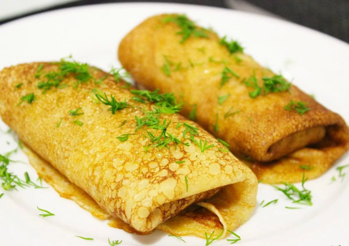 Раскладываем блинчик на тарелке, выкладываем немного начинки и, подвернув края блинчика с трёх сторон, сворачиваем в рулетик так, чтобы начинка оказалась внутри.