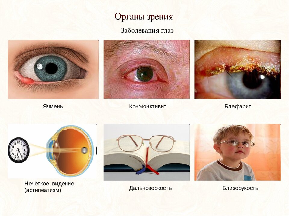 блефароптоз, кератит, кератоконус, кератомаляция, бельмо, конъюнктивит, птеригиум, катаракта, ринит, ретинопатия, глаукома. Там ещё много переписывать, думаю и так достаточно. Картинки к этим болезням не буду подбирать, много места займут и в интернете их полно.