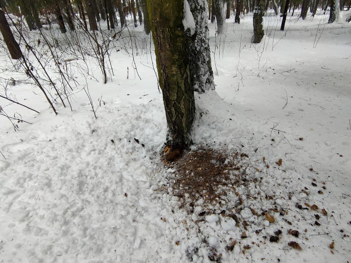 Издалека увидела голову птицы в сугробе. Сразу не поняла, что это дятел, потому что не было характерного стука. Видно было только голову, потому что он достаточно глубоко раскопал снег около дерева. Кору отбрасывал почти на метр: