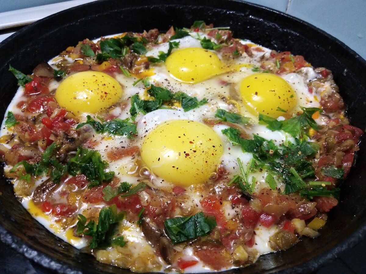 И давно меня посещала мысль приготовить яйца приблизительно в таком же составе овощей, но маринованных. Этакая «шакшука» в соленьях. Сегодня, наконец, приготовил.